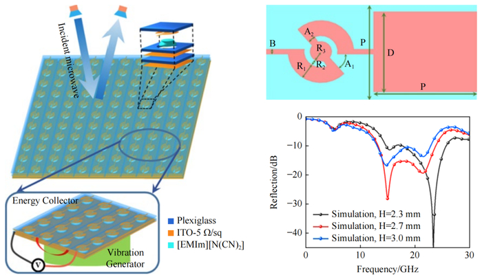 图14 利用深度学习设计兼具波束转向与能量收集功能的超表面方法Yang等提出了一种可通过调节离子液滴高度进行频率调谐的多功能能量收集超表面,如图15所示,可以同时实现不同吸收带宽的切换以及能量的收集和转换功能。