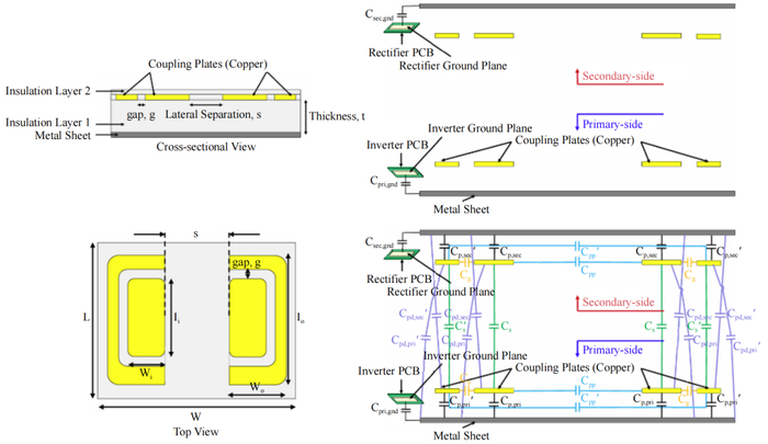 图6 用于磁谐振无线电力传输系统中的可弯曲可折叠超表面如图7所示,Chen等提出了一种用于无线电力传输系统的发射机嵌入式超表面,使更多的磁力线通过接收器,用于在不占用额外体积的同时提高耦合系数和能量传输效率。Rashid等提出了一种用于移动机器人无线充电的低边缘场高功率密度电容式无线电力传输,如图8所示,通过在耦合板周围的金属环引入气隙来实现电容耦合器,从而降低边缘电场。