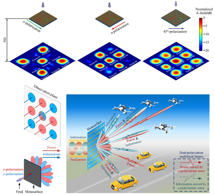 Liu等提出了一种基于各向异性超表面场的多目标极化分集SWIPT方案,设计出了能够独立调制双线极化波的超表面,如图17所示,这使得超表面具有单馈多焦和双馈多焦的辐射特点,可以应用于多目标SWIPT场景。
