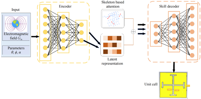 图13 具有极化检测功能的极化敏感能量收集超表面如图14所示,Kumar等利用注意力神经网络(SANN)在12.5 GHz频段贴片天线的上层设计超表面,以实现波束转向能力和射频能量收集功能。
