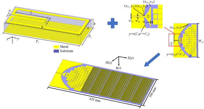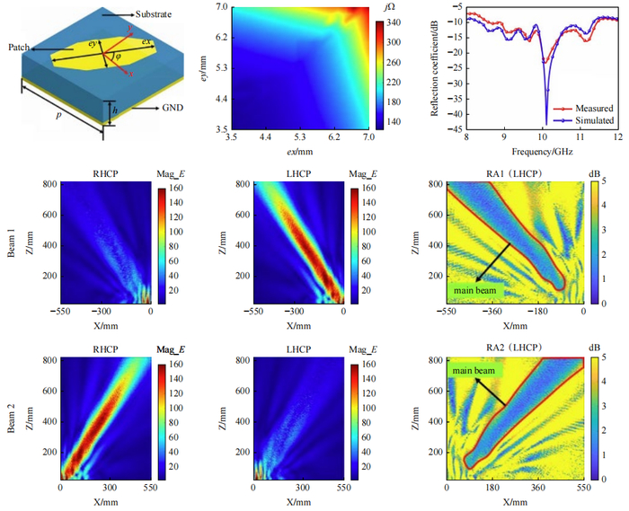 图3 用于产生零阶贝塞尔波束的反射型光学透明超表面Zhao等提出了一种利用全息张量超表面产生具有柔性偏转方向、多波束、任意圆极化的贝塞尔波束的方法,如图4所示,使表面波的调制更加精确。