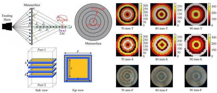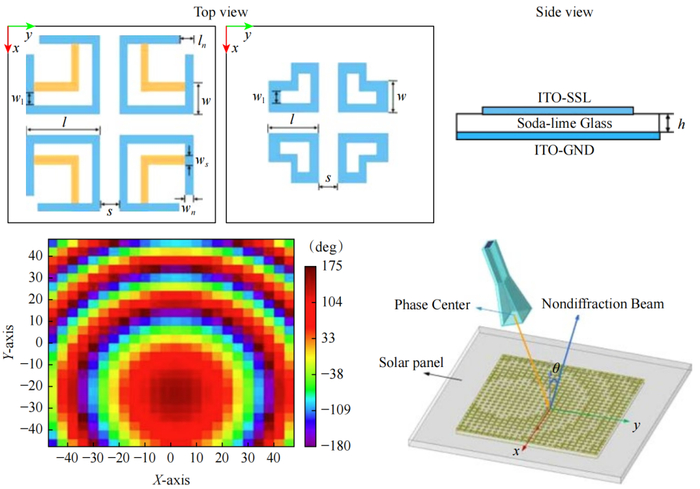 无衍射波束的强度在一定范围内随着传播距离的增加不会发散,在传播过程中的形状和尺度的变化可以人为控制。Dong等在反射型光学透明超表面中应用几何光学方法确定相位分布,从而产生了高效的零阶贝塞尔波束,如图3所示,有望集成到太阳能收集系统中进行高效微波功率传输。