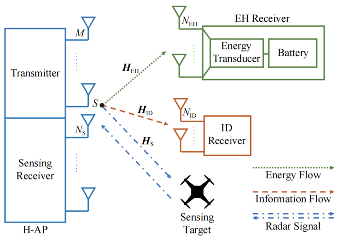 SWIPT系统理想的接收机可以使相同的信号同时传输到能量接收器与信号解码器,但目前还没有实用电路可以实现这种操作。Yu等利用上述功率分集方案进行SWIPT系统的设计,实现了直流射频信号与信息在空间域上的分离,而不需要设计额外的功率分集器或耦合器。如图16所示,Chen等深入研究了传感、通信与供电之间的基本性能的权衡限制,在传感−通信−供电之间得到了最好的平衡。