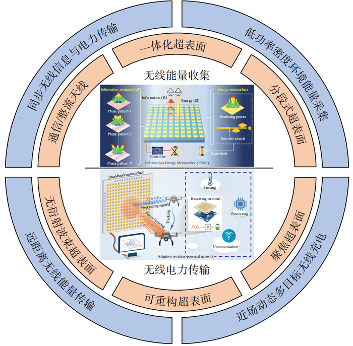 与有线供电技术相比,无线电力传输可以使设备摆脱线缆的限制,降低布置要求与维护成本。然而,由于无线信道的缺陷,如路径损耗、阴影和多径衰落,特别是当能量发射器到接收器的距离较长时,射频无线电力传输通常以较低的能量效率运行。超表面强大的电磁波束调控能力为研究人员提供了解决上述问题的思路。