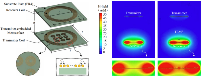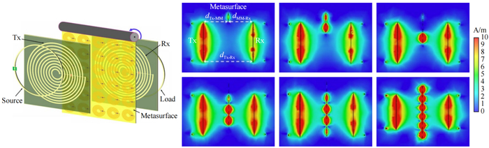 图7 发射机嵌入式超表面结构及有无超表面时的磁场强度对比