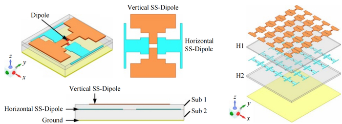 Song等提出了一种阻抗匹配消除技术,省去功率合成网络和整流电路。Wang等设计了由指状组合型结构和方形环结构组成的整流超表面,如图10所示。该结构可以采集覆盖2.4 GHz无线局域网频段的射频能量,且具有极化不敏感的特点。Yu等利用2个具有宽阻抗带宽的正交阶梯状偶极子作为超表面单元,如图11所示。实验表明该结构在工作频带内的能量采集效率始终高于45%,在5 GHz处的峰值效率可达63%。