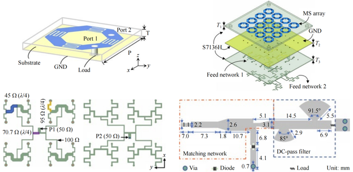 Song等提出了一种宽入射角宽带能量收集超表面。Chang等创新性地提出简化整流电路的方法,如图9所示。可稳定收集射频能量,但同时也有一系列缺点,例如结构复杂、能量损耗大、非线性元件会引起输入阻抗的变化等。