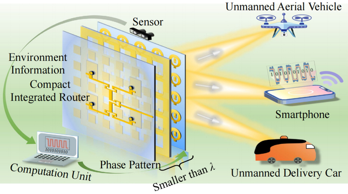 图22 超表面辅助小型移动设备的远程无线充电Li等提出了一个完整的亚波长尺寸无线电力传输框架,如图23所示,保证了低成本和小型化等优点,具有完整的工作流程和极高的可行性,适用于动态多目标的无线充电和信息传输,有望推动超表面无线传输路由器的商业化。