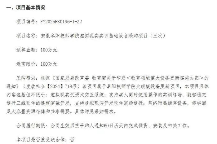 (映维网Nweon 2025年11月20日)安徽阜阳技师学院公告(三次),计划以100万元采购虚拟现实实训基地设备。