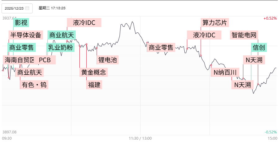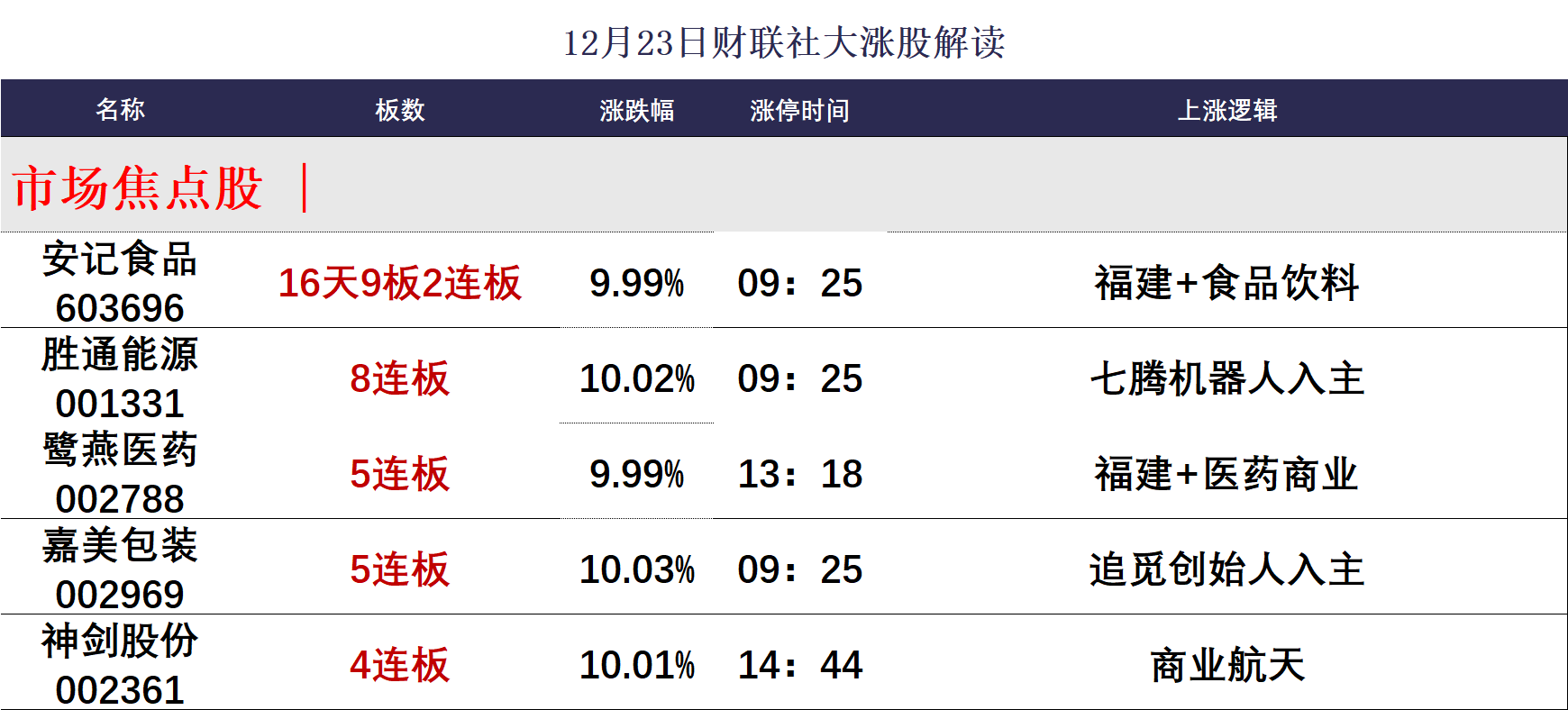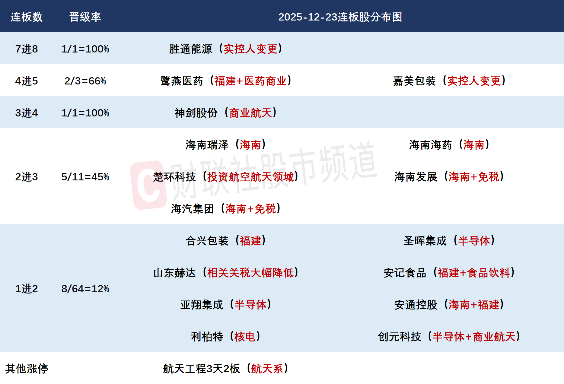 财联社12月23日讯,今日54股涨停,21股炸板,封板率为72%,胜通能源8连板,鹭燕医药5连板,嘉美包装8天6板,神剑股份4连板,海汽集团、海南发展、海南瑞泽、海南海药(维权)、楚环科技3连板,安记食品16天9板,安记食品6天3板。市场冲高回落,三大指数一度集体翻绿,创业板指盘中涨超1%。沪深两市成交额1.9万亿,较上一个交易日放量379亿。全市场近3900只个股下跌。板块方面,光刻机、电池、海南自贸区等板块涨幅居前,旅游及酒店、商业航天等板块跌幅居前。截至收盘,沪指涨0.07%,深成指涨0.27%,创业板指涨0.41%。