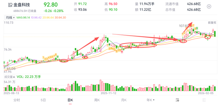 其二级市场的股价表现,金盘科技走势属于典型的机构标的,沿着20日均线稳稳向上,去年股价也实现翻倍。