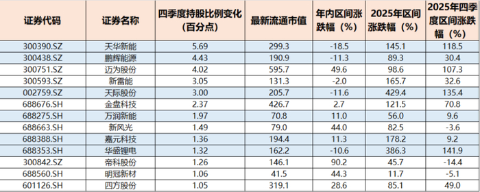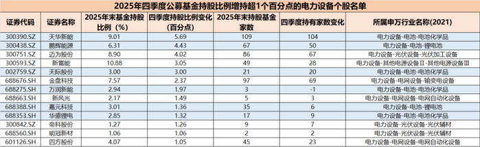 全市场看,四季度电力设备个股中有13只个股获公募基金的明显增持,其持股占流通股的比例环比提升超过1个百分点。其中,电池相关个股尤被公募看好,占据6席。
